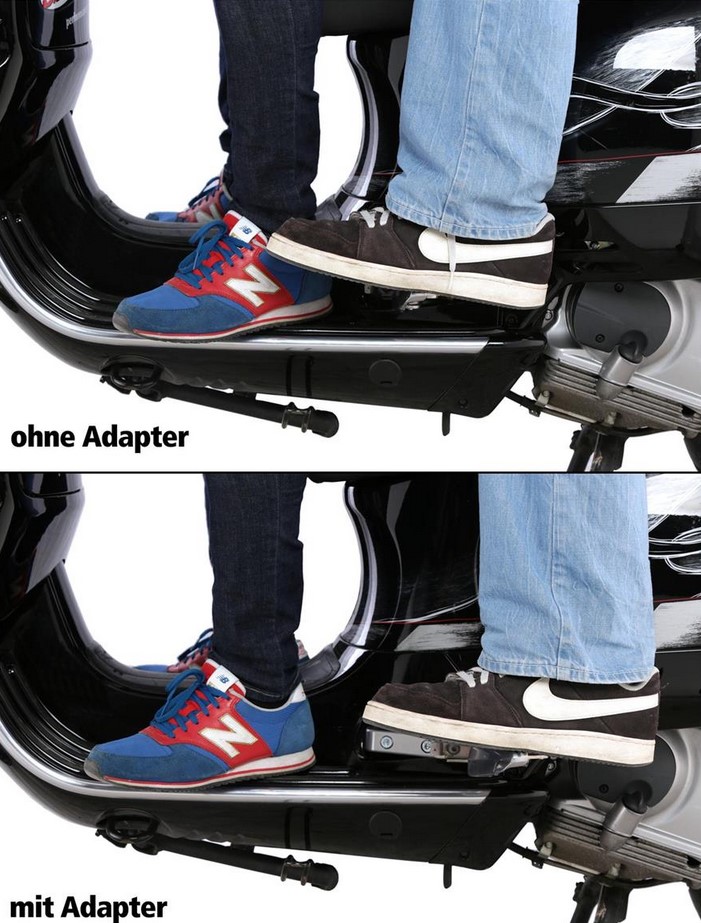 Il posizionamento enormemente sfavorevole delle pedane originali pone solitamente i seguenti problemi: se le gambe sono troppo corte, sono difficili da raggiungere per il passeggero, se le gambe sono troppo lungo, di solito intralciano i conducenti. L'adattatore poggiapiedi per le pedane originali dei modelli Vespa GTS/GTS Super/GTV/GT 60/GT/GT L può aiuto. Questi sono posizionati all'indietro e creano molto più spazio per le gambe per il guidatore e il passeggero anteriore. Grazie alla posizione modificata delle pedane, il passeggero si siede molto più comodamente e rilassato. L'autista ha anche molto più spazio per le gambe. Il comfort di guida è migliorato del 100%. Il montaggio dura circa 10 minuti per lato. Adatto solo con riserva in combinazione con barre di protezione.