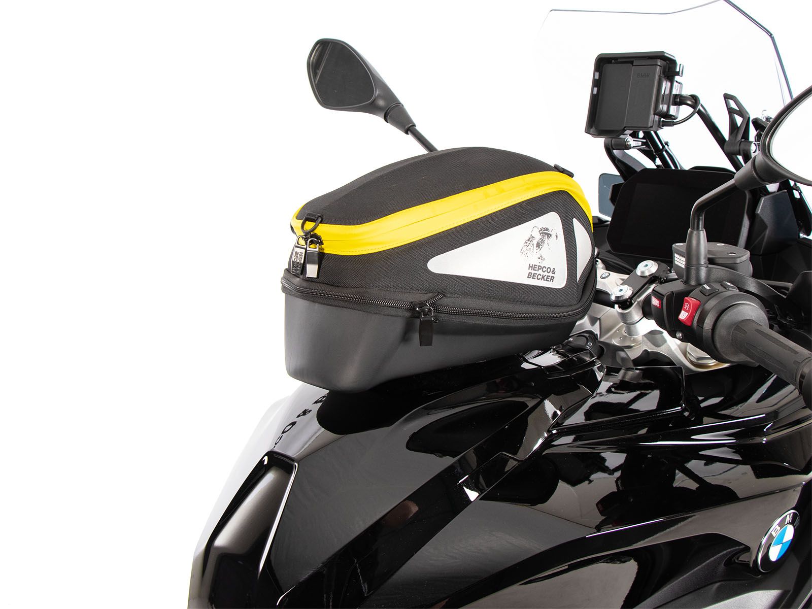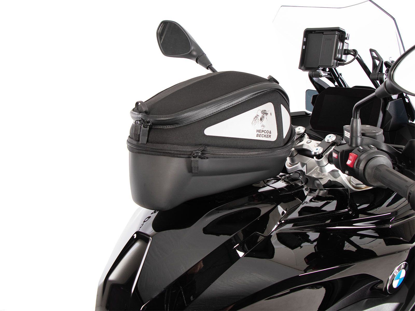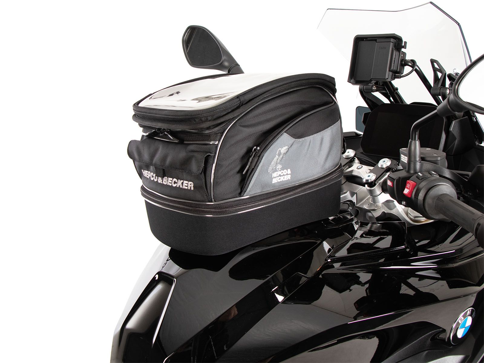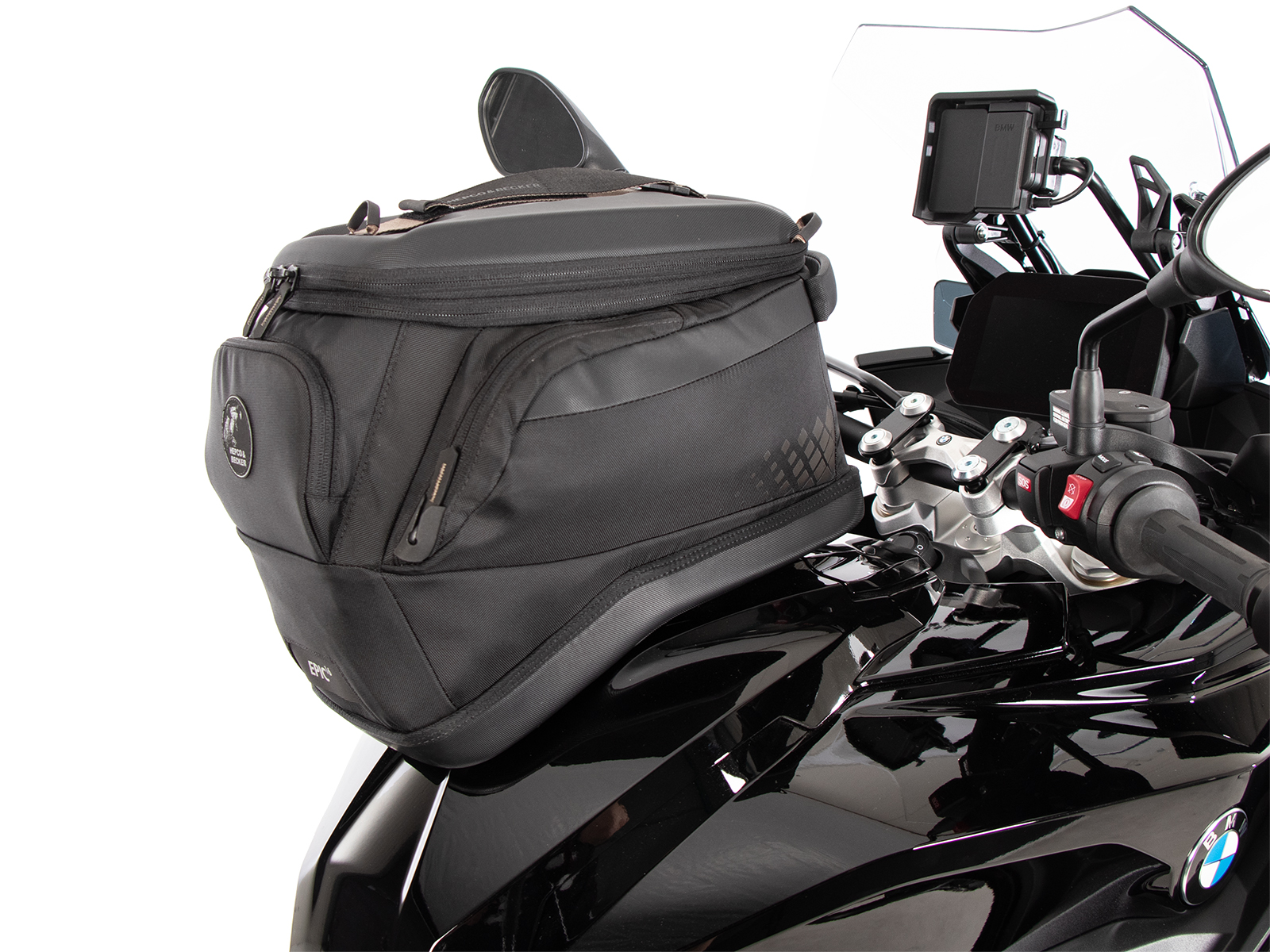 - La borsa da serbatoio Hepco & Becker si indossa semplicemente e si blocca in modo chiaramente percepibile sull'anello del serbatoio