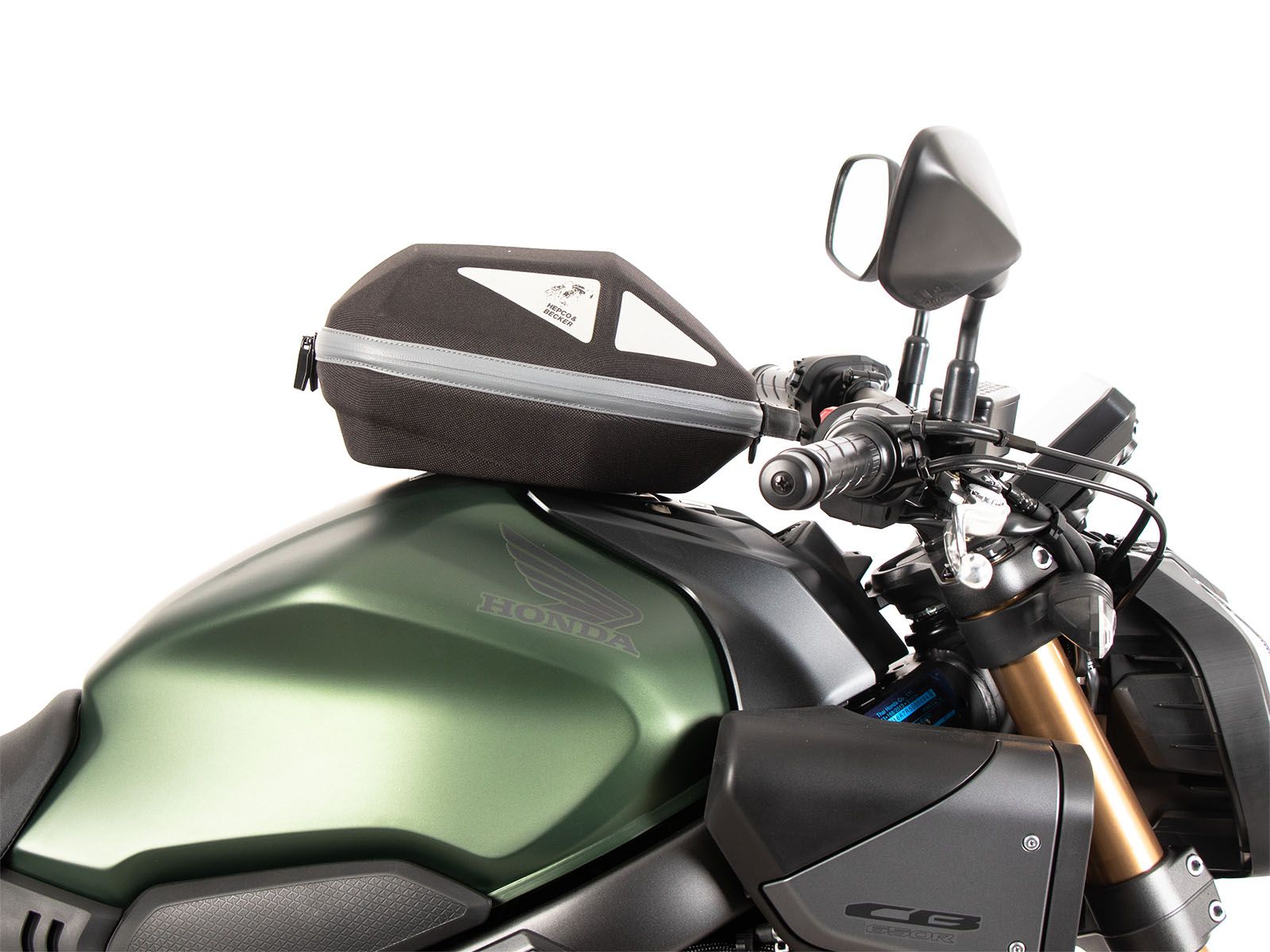 - La borsa da serbatoio Hepco & Becker si indossa semplicemente e si blocca in modo chiaramente percepibile sull'anello del serbatoio