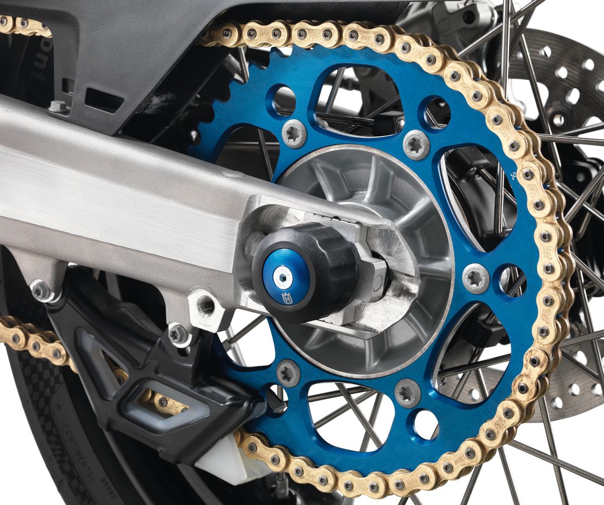 Per proteggere il forcellone e l'assale posteriore. Il dado originale dell'assale viene rimosso e viene montato il dado aperto in dotazione. Cuscinetti in plastica con inserti in alluminio anodizzato blu. Biella in alluminio.