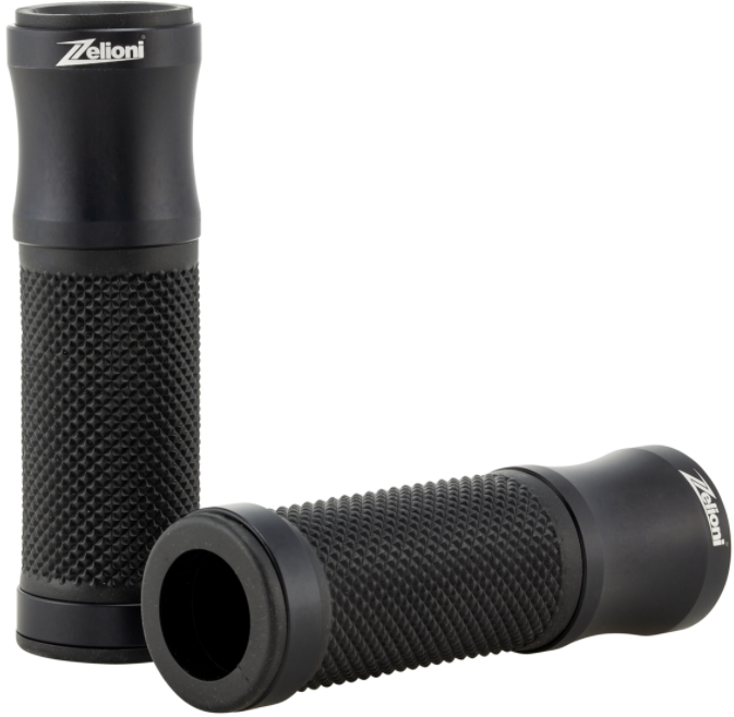 Impugnatura ergonomica   con palmo gommato. Cappucci in alluminio con logo ZELIONI  inciso a laser. Estremità aperte per il montaggio di contrappesi/specchi di estremità della barra. Disponibile in diverse varianti di colore.