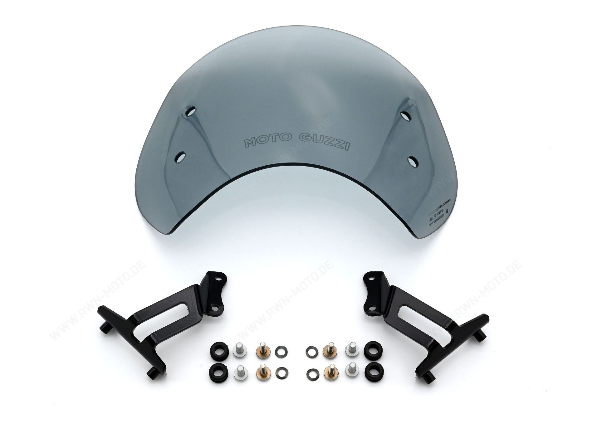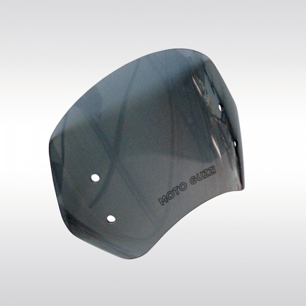 • Parabrezza piccolo e scuro dal design sportivo con logo Moto Guzzi. Migliora l'aerodinamica. Include una staffa.