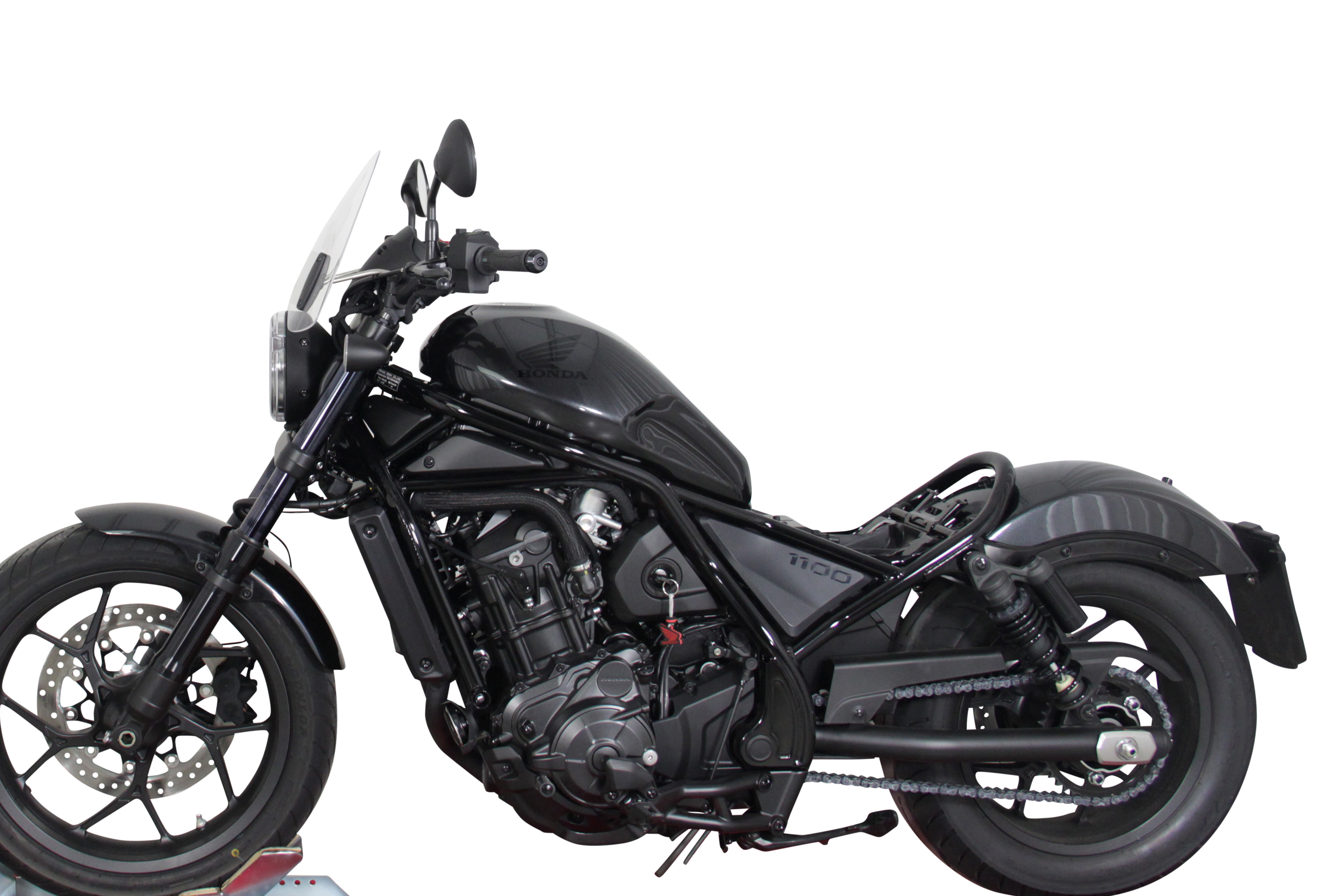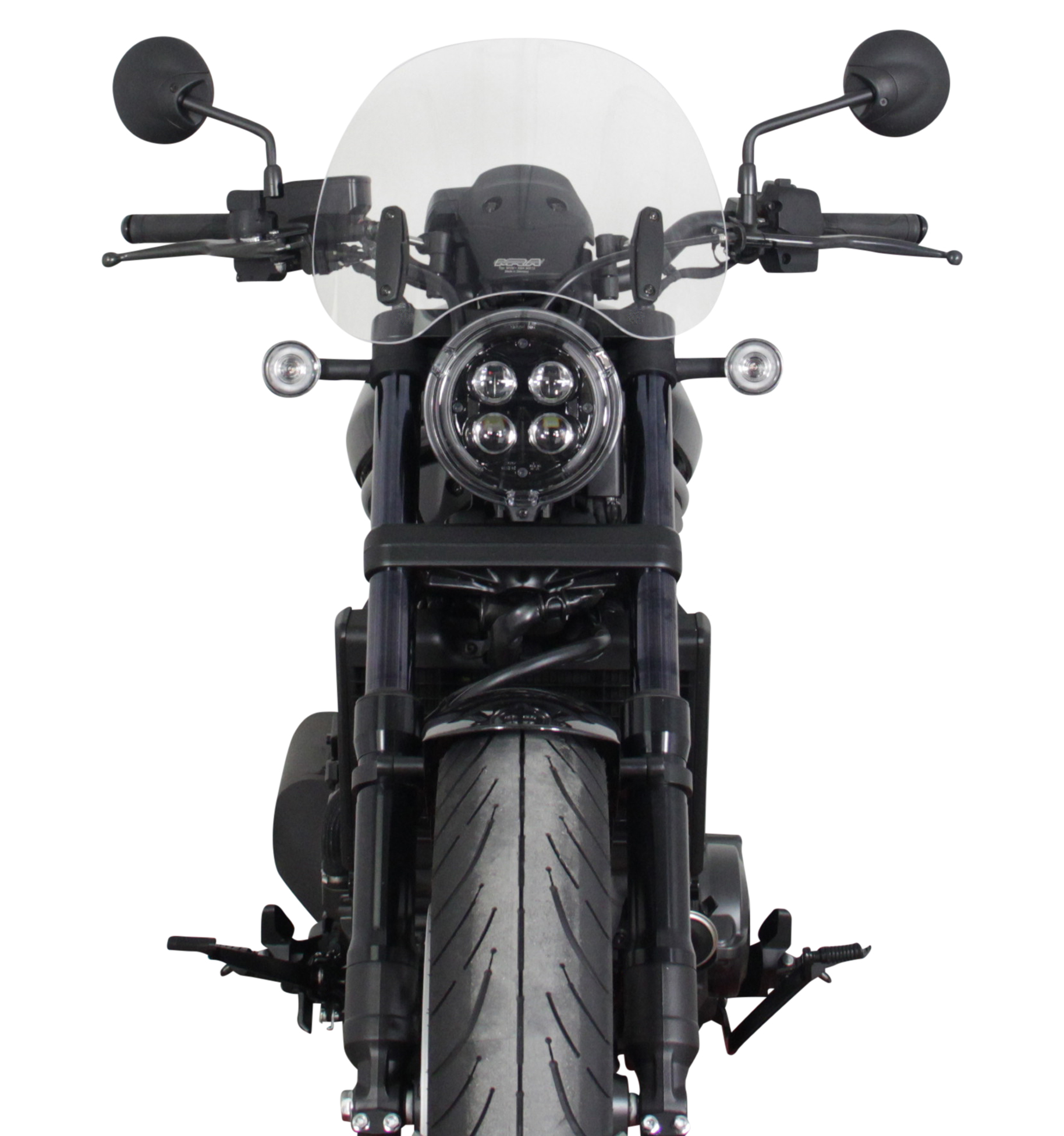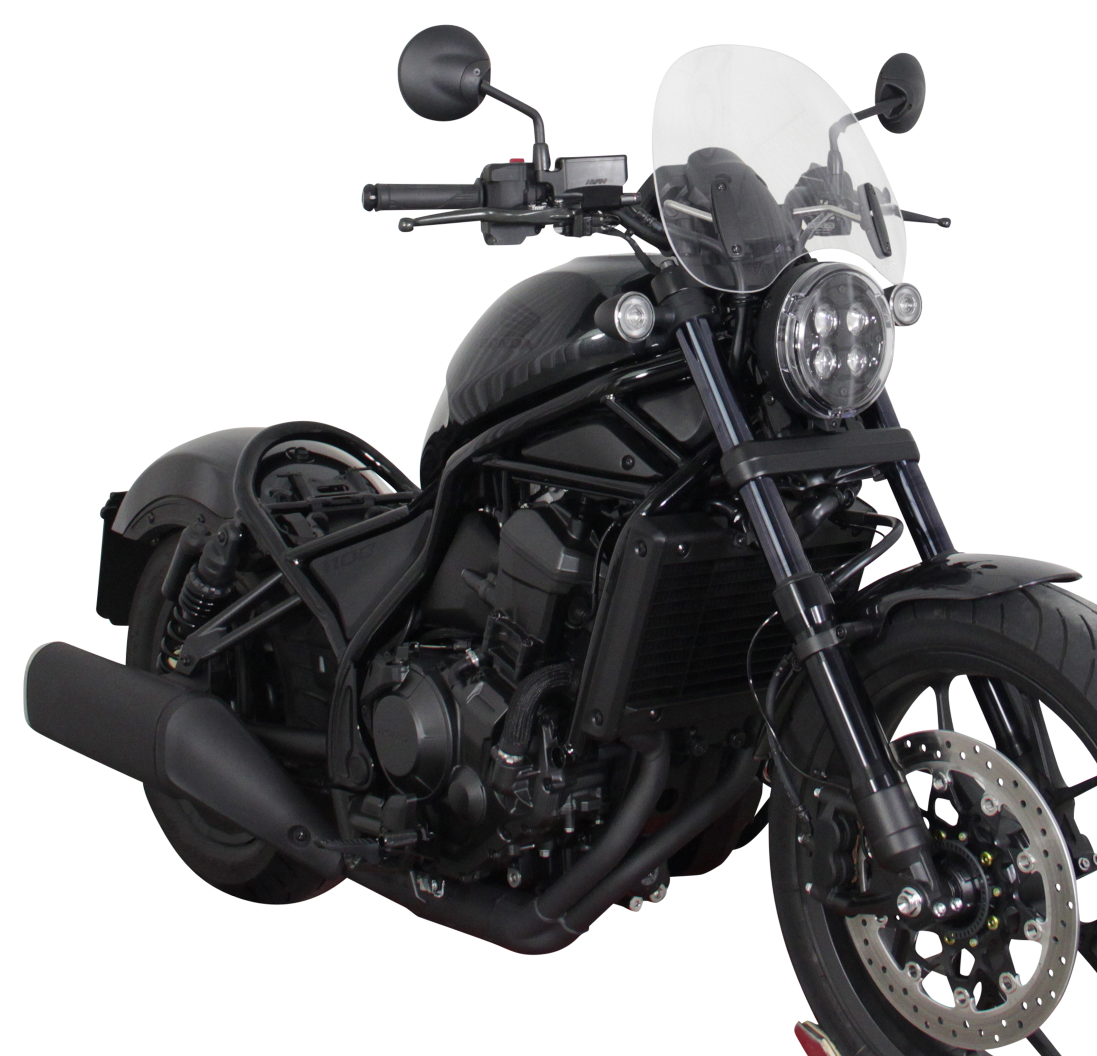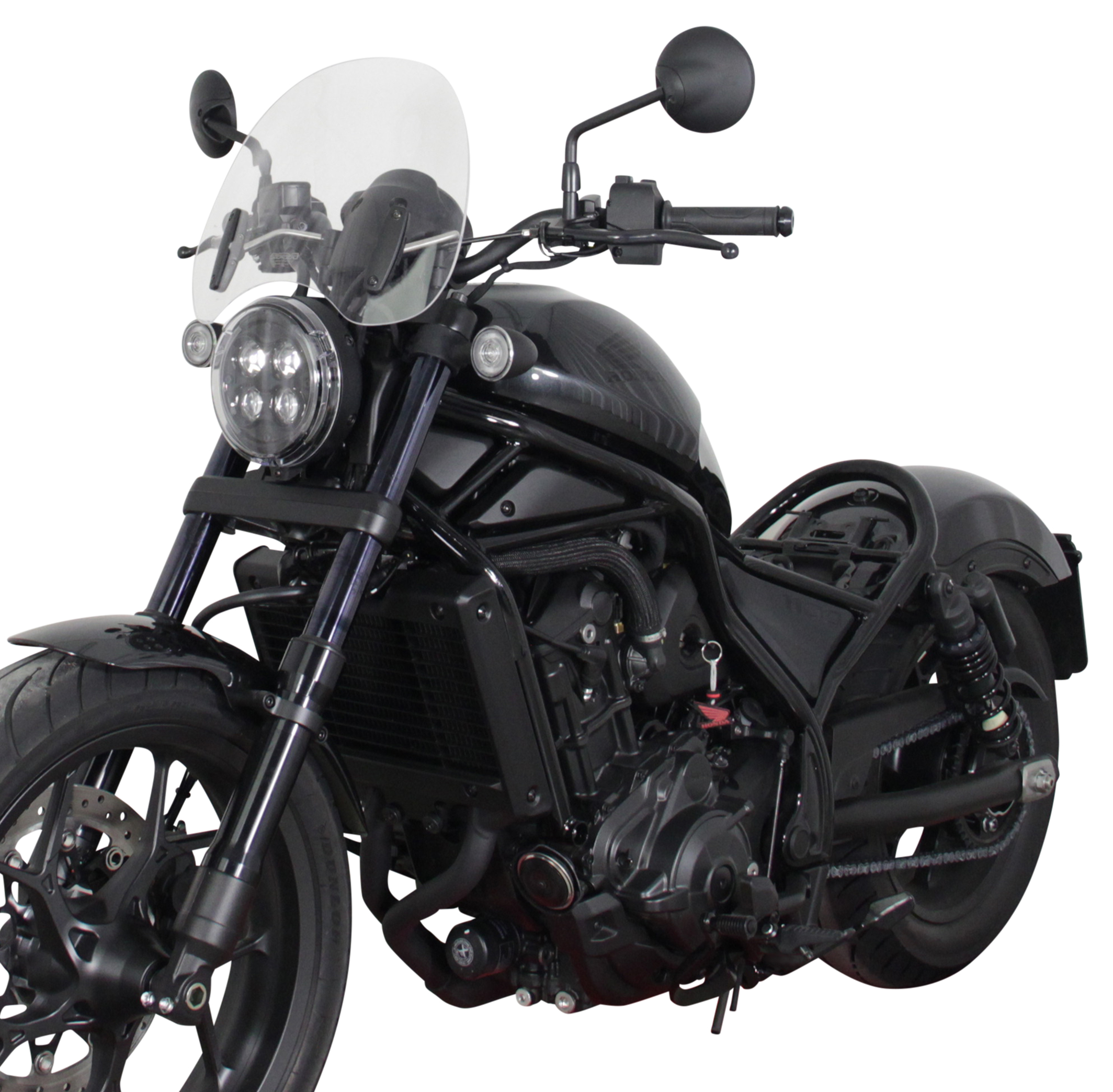 La Rebel da 500cc è ora seguita da una versione più grande: la CMX1100 Rebel. La Rebel può essere dotata di un parabrezza da turismo MRA per ottenere una sensazione di leggerezza e genialità da cruiser. Piccolo (32 cm di lunghezza e 38 cm di larghezza) ma elegante, tiene a bada la fastidiosa pressione del vento e si integra perfettamente nell'insieme. Il disco da turismo si fissa al manubrio con morsetti e aste, tutti inclusi nella confezione. Disponibile nei colori trasparente, grigio fumo e nero.