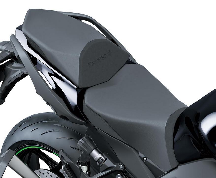 Il sedile in gel in due pezzi aumenta il comfort per il conducente e il passeggero. Il materiale del rivestimento del sedile riflette la luce del sole, evitando che il sedile si riscaldi eccessivamente. Il coprisella presenta un materiale a contrasto sul lato e un logo Kawasaki ricamato. Altezza del sedile 835 mm