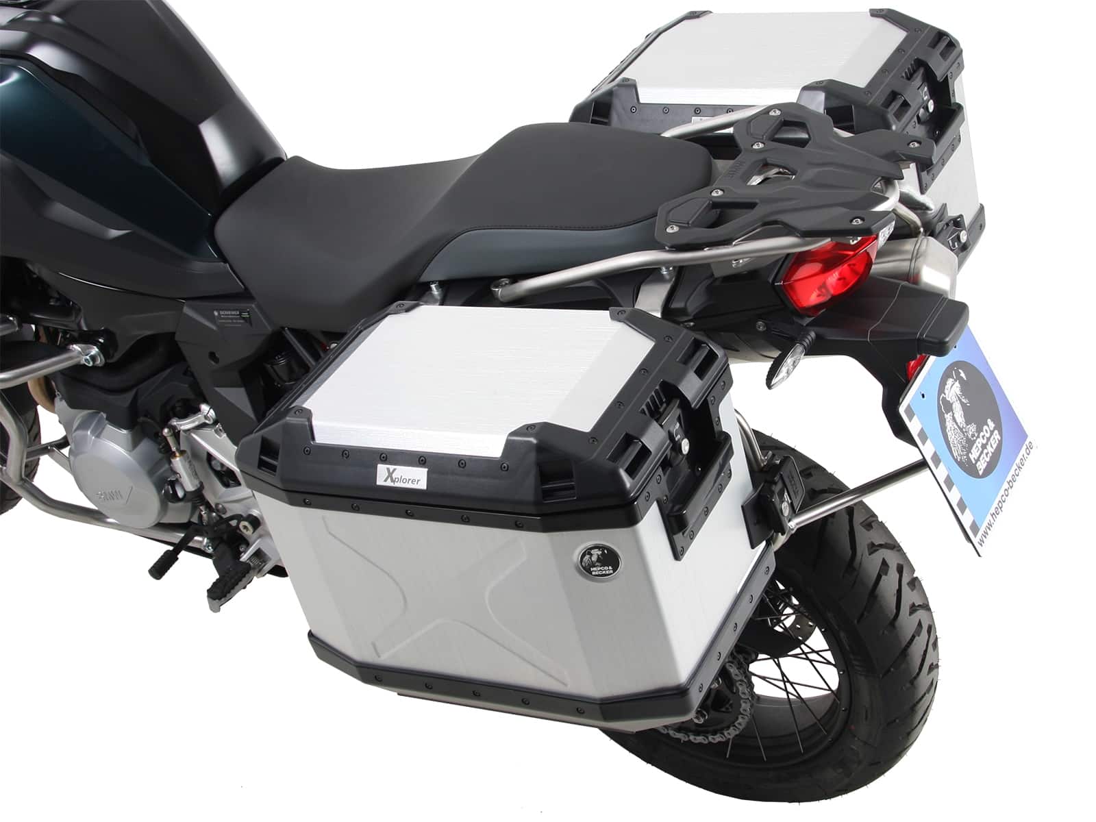 Set composto da un portapacchi bifacciale Motorbike specifico per il modello in acciaio inox in combinazione con una valigia Xplorer 40 e una valigia Xplorer 37 incassata, inclusi chiave, cilindro della serratura e gli adattatori per la serratura necessari per fissare le valigie al portapacchi