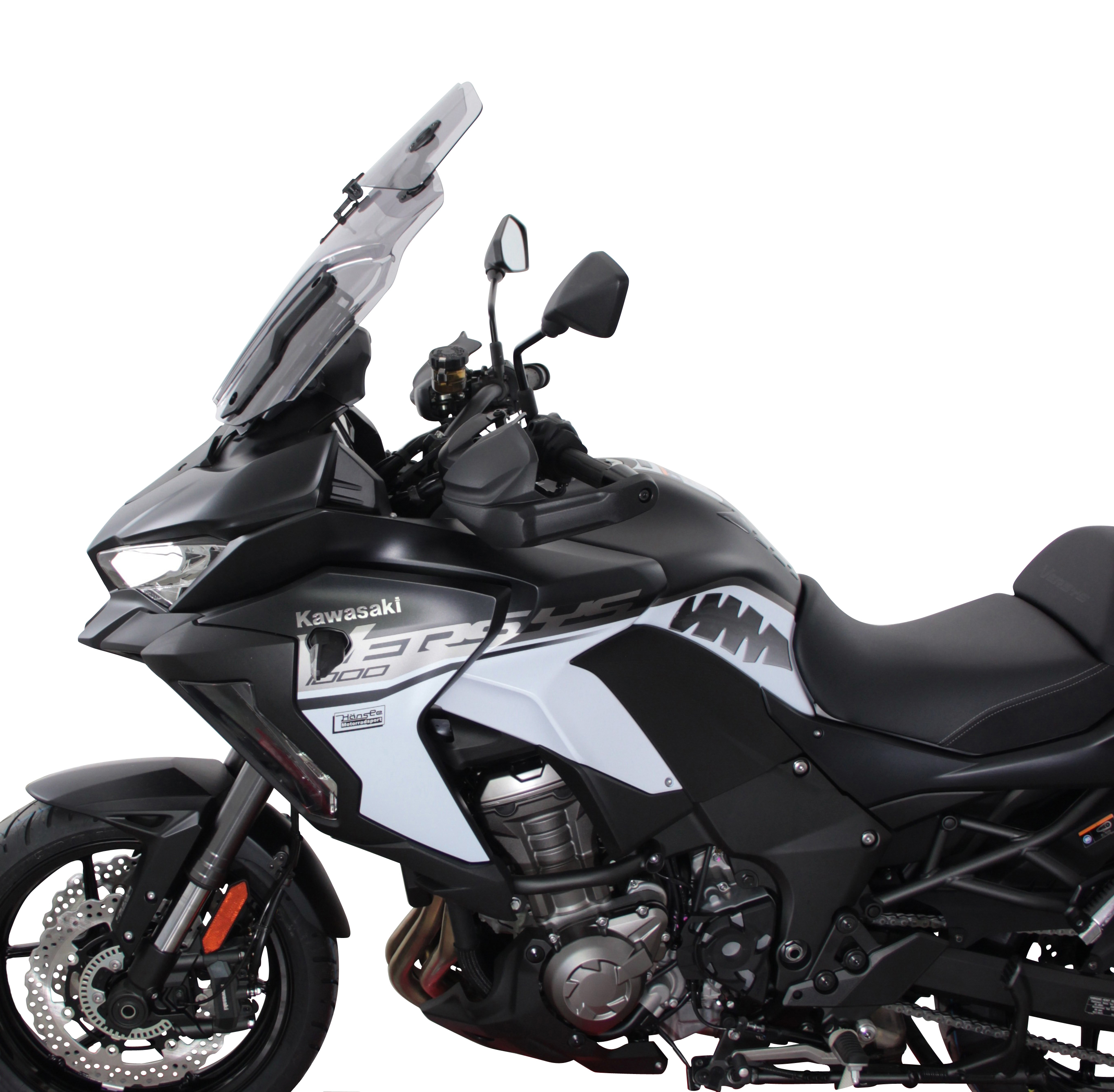 Tutta l'esperienza acquisita con i collaudati schermi MRA regolabili, come Varioscreen (V), Vario-Touring (VT) o X-Creen (XC), è stata la base per lo sviluppo di questo nuovo schermo in due parti. Una caratteristica che colpisce è la grande parte superiore, che è attaccata al paravento di base con un totale di tre doppi giunti. Ciò si traduce in una connessione particolarmente stabile, anche a velocità elevate. Grazie alle numerose possibilità di regolazione dell'angolo, della lunghezza e della distanza, il flusso d'aria tra il disco e la parte superiore del disco può essere diretto in modo tale che la pressione del vento venga deviata verso l'alto quasi senza turbolenze e che il casco e la parte superiore del corpo si trovino nella scia.